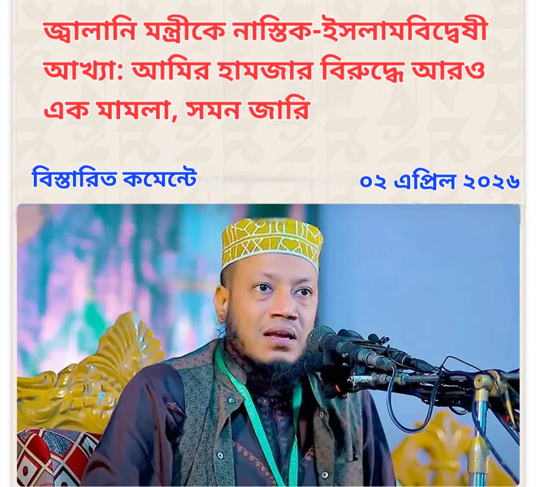 সিরাজগঞ্জ প্রতিনিধি।। জ্বালানি মন্ত্রী ইকবাল হাসান মাহমুদ টুকুকে ‘নাস্তিক’ ও ‘ইসলামবিদ্বেষী’ আখ্যা দেওয়ার অভিযোগে কুষ্টিয়া-৩ (সদর) আসনের সংসদ সদস্য ও জামায়াত নেতা মুফতি আমির হামজার বিরুদ্ধে সিরাজগঞ্জের আদালতে আরও একটি মানহানির মামলা হয়েছে। আদালত অভিযোগ আমলে নিয়ে তার বিরুদ্ধে সমন জারি করেছেন। আজ বৃহস্পতিবার দুপুরে সিরাজগঞ্জের চৌহালী উপজেলা আমলি আদালতের সিনিয়র জুডিশিয়াল ম্যাজিস্ট্রেট মো. সুমন ভুঁইয়া এ আদেশ দেন।