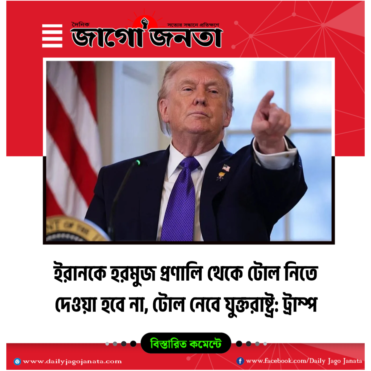ইরানকে হরমুজ প্রণালি থেকে টোল নিতে দেওয়া হবে না, টোল নেবে যুক্তরাষ্ট্র: ট্রাম্প