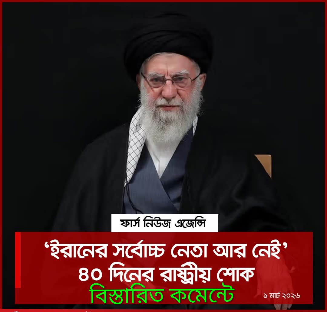 সর্বোচ্চ নেতার মৃত্যুতে ইরানে রোববার (১ মার্চ) থেকে ৪০ দিনের রাষ্ট্রীয় শোক ঘোষণা করা হয়েছে বলে জানিয়েছে ইরান ইন্টারন্যাশনাল।