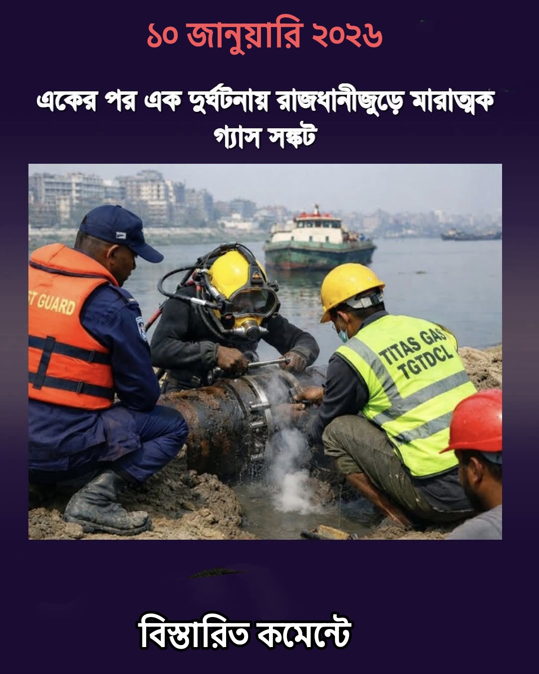 এর আগে শুক্রবার (৯ জানুয়ারি) তিতাস গ্যাস জানিয়েছিল, ঢাকার আমিনবাজার এলাকায় তুরাগ নদীর তলদেশে ট্রলারের নোঙরের আঘাতে একটি গ্যাস পাইপলাইনে ছিদ্র হয়। পরে পাইপলাইনটি মেরামত করা হলেও মেরামতের সময় পাইপের ভেতরে পানি প্রবেশ করে।