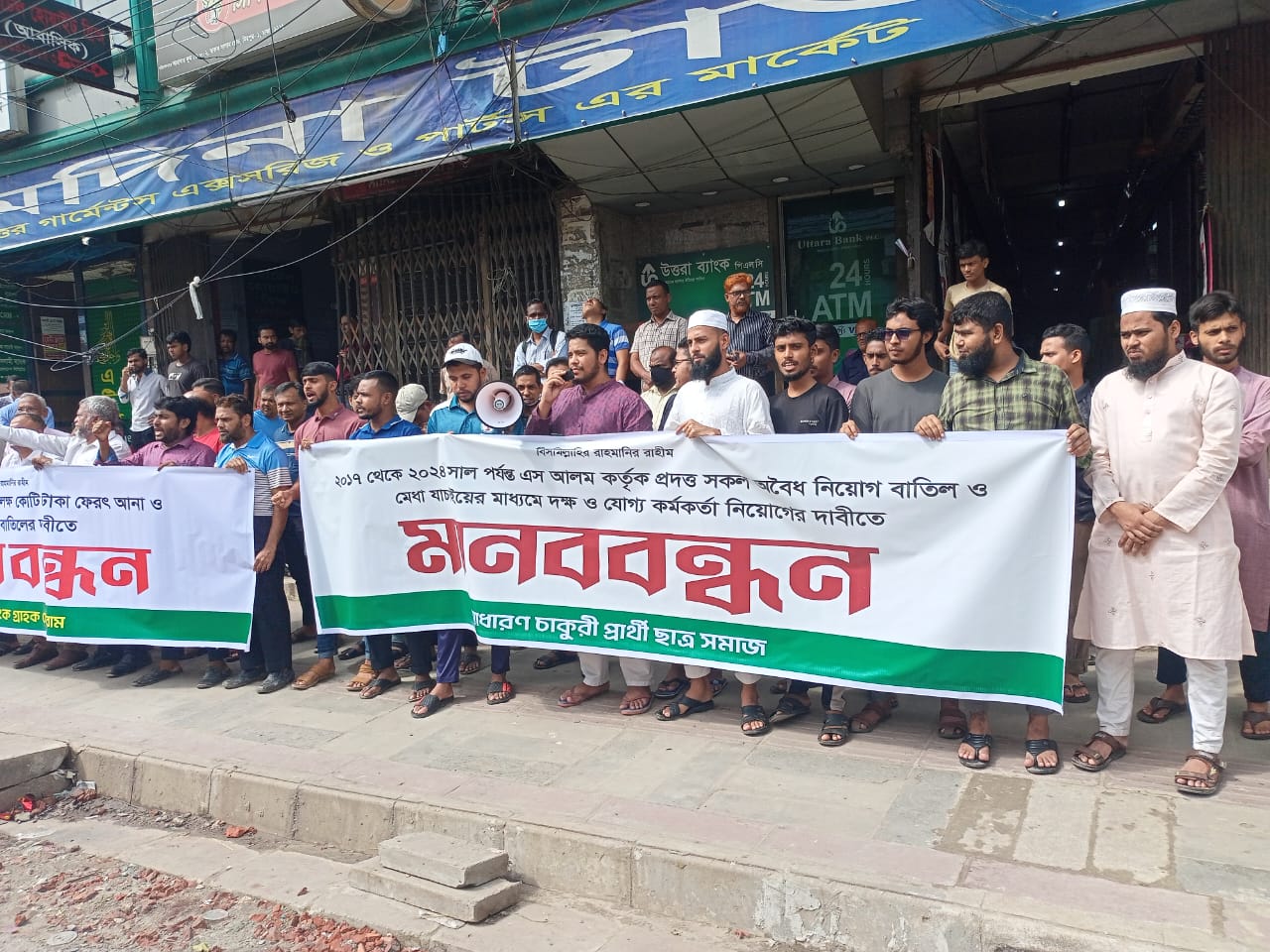 মানববন্ধনে গ্রাহকদের পক্ষ থেকে বক্তব্য রাখেন, ব্যাংকের গ্রাহক সেমকো কেমিক্যালের মালিক আব্দুস সামাদ, সেবা ল্যাবরেটরীজ এর মালিক ডাক্তার মোঃ মঈন উদ্দিন এবং ব্যাংকের গ্রাহক ও বিশিষ্ট আইনজীবী মোহাম্মদ ইরফানুল হক। এছাড়া সাধারণ চাকুরী প্রার্থী শিক্ষার্থীগণ ২০১৭ সাল থেকে ২০২৪ সাল পর্যন্ত নিয়োগ পরীক্ষা ছাড়া অবৈধভাবে নিয়োগকৃত সকল নিয়োগ বাতিল করে মেধা ও দক্ষতার ভিত্তিতে নতুন নিয়োগের দাবী জানান।