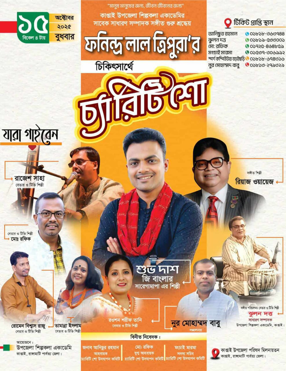 রাঙামাটির কাপ্তাই উপজেলা শিল্পকলা একাডেমির প্রাক্তন সাধারণ সম্পাদক, অবসরপ্রাপ্ত শিক্ষক এবং সঙ্গীতগুরু ফনিন্দ্র লাল ত্রিপুরার চিকিৎসা সহায়তায় আগামী ১৫ অক্টোবর বুধবার বিকেল ৪টা থেকে কাপ্তাই উপজেলা পরিষদ মিলনায়তনে অনুষ্ঠিত হবে চ্যারিটি শো “মানুষ মানুষের জন্য, জীবন জীবনের জন্য”। কাপ্তাই উপজেলা শিল্পকলা একাডেমি এই অনুষ্ঠানের আয়োজক।