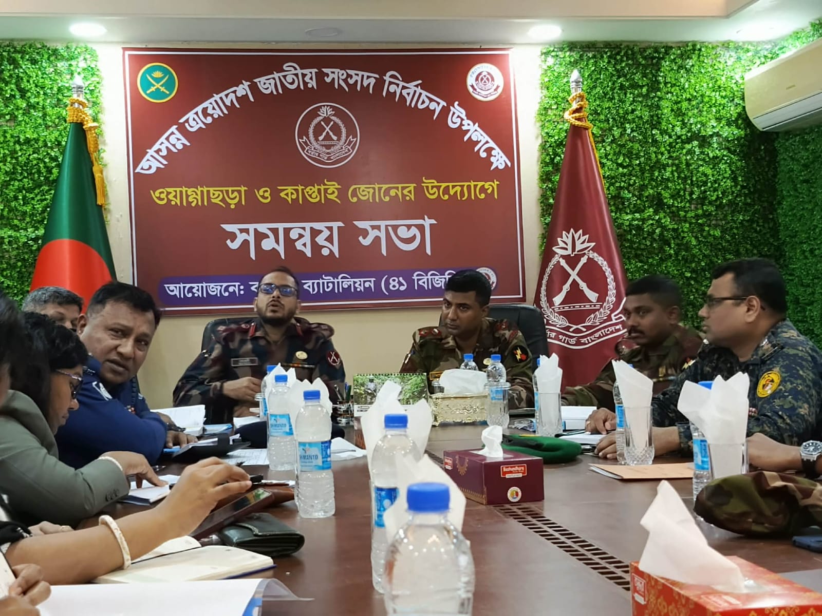ত্রয়োদশ জাতীয় সংসদ নির্বাচন ও গণভোট সুষ্ঠুভাবে সম্পাদনে বিজিবিসহ সকল আইনশৃঙ্খলা বাহিনী নিরপেক্ষভাবে দায়িত্ব পালন করবে বলে মন্তব্য করেছেন কাপ্তাই ব্যাটালিয়ন (৪১ বিজিবি)-এর অধিনায়ক লেফটেন্যান্ট কর্নেল কাওসার মেহেদী (সিগন্যালস)।  ত্রয়োদশ জাতীয় সংসদ নির্বাচন ও গণভোট–২০২৬ উপলক্ষে কাপ্তাই ব্যাটালিয়ন (৪১ বিজিবি)-এর কনফারেন্স রুমে আয়োজিত সমন্বয় সভায় সভাপতির বক্তব্যে তিনি এ মন্তব্য করেন। মঙ্গলবার (২৭ জানুয়ারি) সকাল সাড়ে ১১টায় বিজিবি ওয়াগ্গাছড়া জোন এবং কাপ্তাই জোনের আয়োজনে এ সমন্বয় সভা অনুষ্ঠিত হয়। এ সময় বক্তব্য রাখেন বাংলাদেশ সেনাবাহিনীর কাপ্তাই রণজয়ী ৩৮ বীর-এর কাপ্তাই জোন কমান্ডার লেফটেন্যান্ট কর্নেল মুহাম্মদ নাজমুল কাদির (শুভ), পিএসসি। এ সময় তিনি বলেন, আসন্ন ত্রয়োদশ জাতীয় সংসদ নির্বাচন ও গণভোট সুষ্ঠুভাবে সম্পাদনের লক্ষ্যে কাপ্তাই সেনা জোনের দায়িত্বপূর্ণ এলাকায় টহল জোরদার করা হয়েছে। আগামী ১৪ ফেব্রুয়ারি ২০২৬ ইং তারিখ পর্যন্ত দায়িত্ব পালন করা হবে। বডি ক্যামেরা ব্যবহারসহ আইনশৃঙ্খলা বাহিনীর সমন্বয়ে সকল ধরনের নির্বাচনী কেন্দ্রগুলোতে নিরাপত্তার জন্য দায়িত্ব পালন করা হবে। সমন্বয় সভায় কাপ্তাই সার্কেলের অতিরিক্ত পুলিশ সুপার মো. জাহেদুল ইসলাম, কাপ্তাই সহকারী কমিশনার (ভূমি) নেলী রুদ্র, কাপ্তাই উপজেলা নির্বাচন অফিসার মিতা পারিয়াল, ২৩ ও ৩৫ আনসার ব্যাটালিয়ন পরিচালক, ১০ আর ই ব্যাটালিয়নের প্রতিনিধি, কাপ্তাই ও চন্দ্রঘোনা থানার অফিসার এবং মিডিয়া কর্মীবৃন্দ উপস্থিত থেকে মত প্রকাশ করেন।