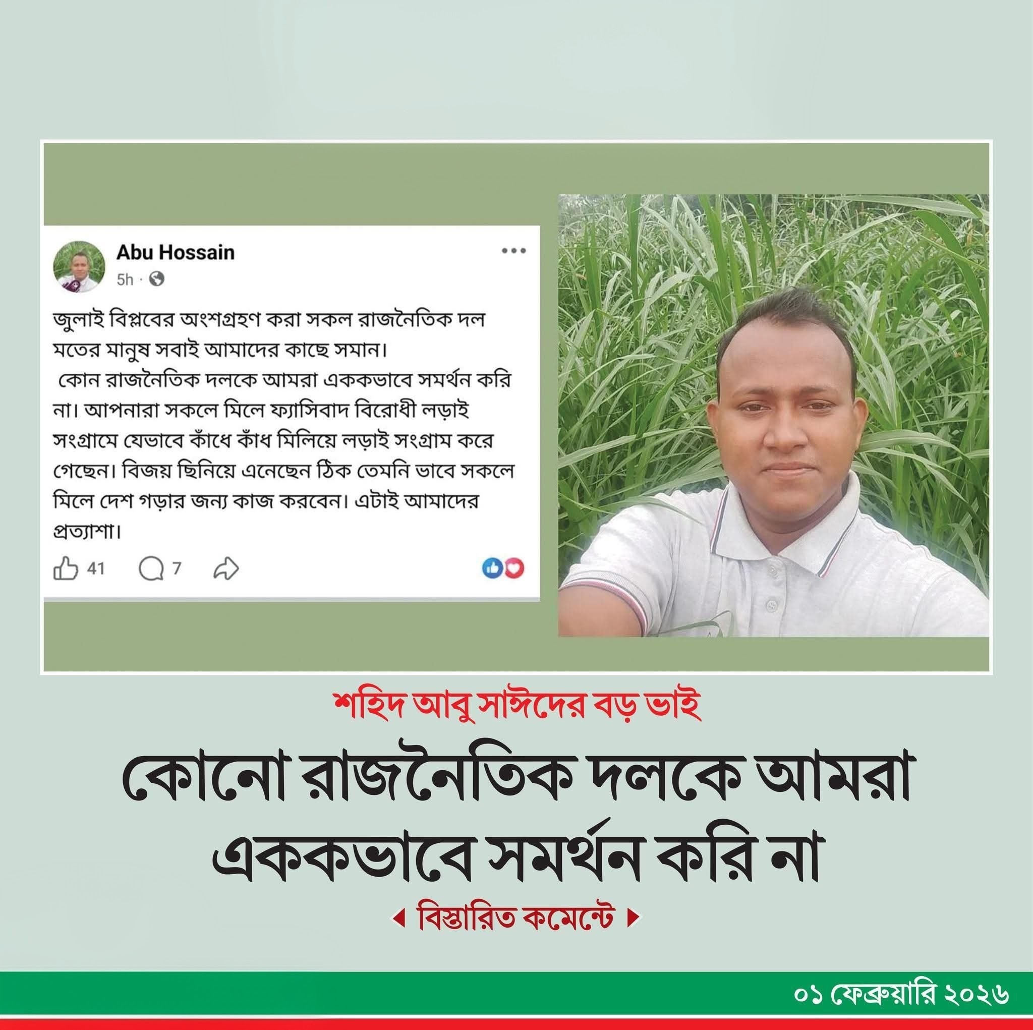 শনিবার রাত ১১টার দিকে জুলাই ছাত্র-জনতার অভ্যুত্থানে শহীদ আবু সাঈদের বড় ভাই আবু হোসেন তার ফেসবুক পোস্টে এমন মন্তব্য করেছেন।
