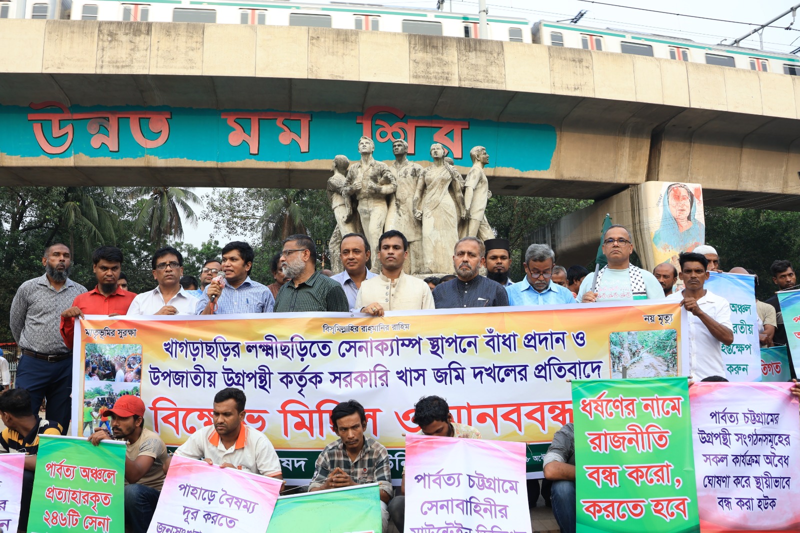 ঢাকা বিশ্ববিদ্যালয় প্রতিনিধি: খাগড়াছড়ির লক্ষ্মীছড়িতে সেনা ক্যাম্প স্থাপনে বাধা প্রদান ও উপজাতীয় উগ্রপন্থী কর্তৃক সরকারি খাস জমি দখলের প্রতিবাদে আজ ২৮ অক্টোবর (২০২৫) মঙ্গলবার বিকালে ঢাকা বিশ্ববিদ্যালয়ের রাজু ভাস্কর্যের পাদদেশে মানববন্ধন করেছে সার্বভৌমত্ব সুরক্ষা পরিষদের স্টুডেন্টস ইউনিটের নেতা-কর্মীরা। মানববন্ধন শেষে বিক্ষোভ মিছিল করেছে শতাধিক ছাত্র-জনতা।