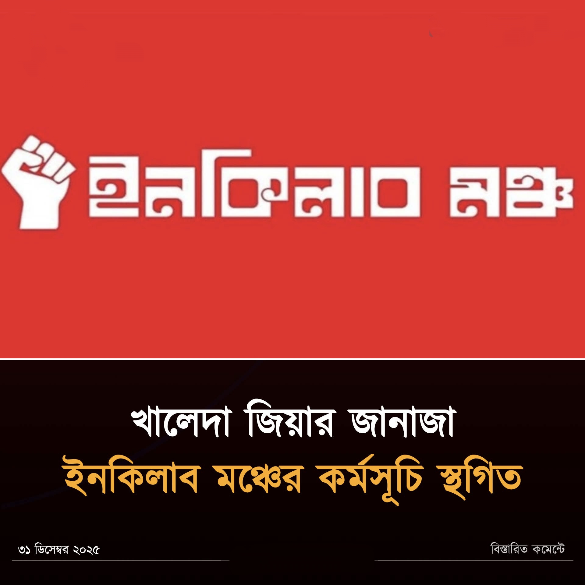 পোস্টে সংগঠনটি জানায়, বুধবার (৩১ ডিসেম্বর) দুপুর ২টায় রাজধানীর মানিক মিয়া এভিনিউ ও সংসদ ভবনের দক্ষিণ প্লাজায় বিএনপি চেয়ারপারসন খালেদা জিয়ার জানাজা অনুষ্ঠিত হবে। এ উপলক্ষে ইনকিলাব মঞ্চের কর্মসূচি স্থগিত ঘোষণা করা হয়েছে। সবাইকে খালেদা জিয়ার জানাজায় অংশগ্রহণ করার জন্য অনুরোধ করা হলো।