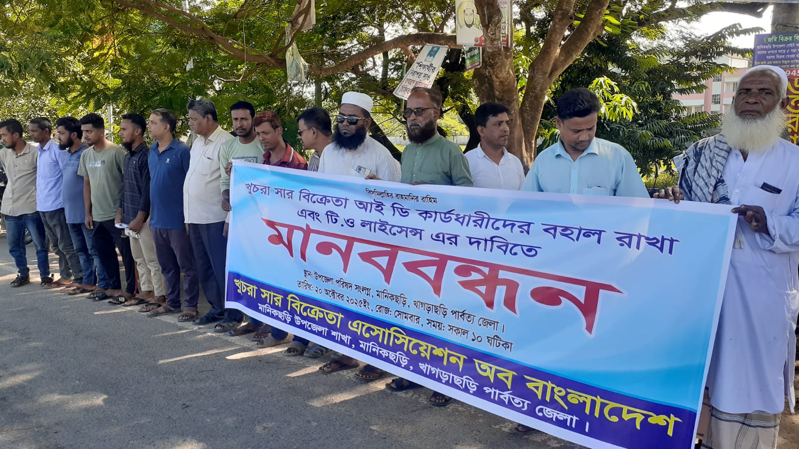 সারাদেশে খুচরা সার বিক্রেতা লাইসেন্স বাতিল প্রক্রিয়া স্থগিত করা ও টিও নিবন্ধন প্রদানের দাবিতে খাগড়াছড়ির মানিকছড়ি উপজেলার খুচরা সার বিক্রেতারা মানববন্ধন ও স্মারকলিপি প্রদান করেছেন।