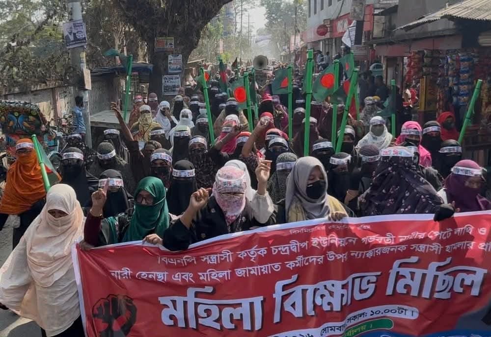 গর্ভবতী নারীকে হেনস্তার প্রতিবাদে বাউফলে মহিলা জামায়াতের বিক্ষোভ মিছিল