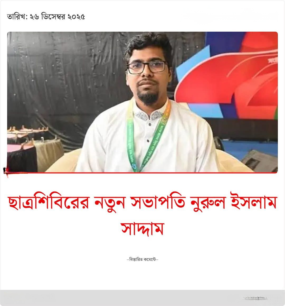নিজস্ব প্রতিবেদক।। বাংলাদেশ ইসলামী ছাত্রশিবিরের ২০২৬ সেশনের জন্য নতুন সভাপতি হিসেবে নির্বাচিত হয়েছেন নুরুল ইসলাম সাদ্দাম।