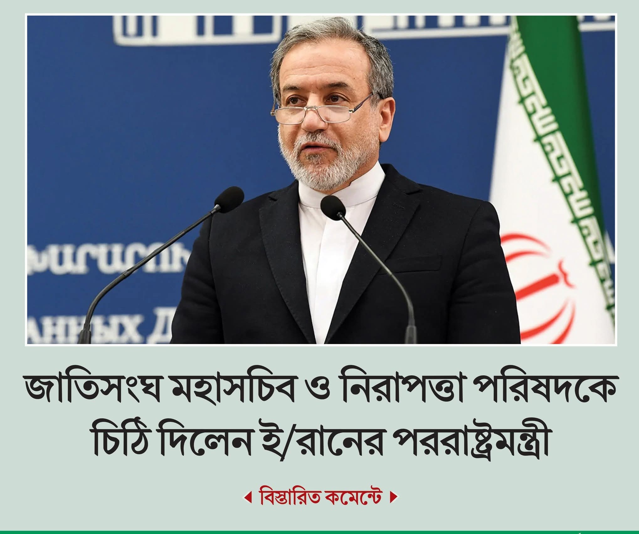 ডেস্ক রিপোর্ট।। জাতিসংঘের মহাসচিব আন্তোনিও গুতেরেস ও জাতিসংঘ নিরাপত্তা পরিষদকে চিঠি পাঠিয়েছেন ইরানের পররাষ্ট্রমন্ত্রী আব্বাস আরাগচি। চিঠিতে যুক্তরাষ্ট্র ও ইসরাইলের হামলায় ইরানের সর্বোচ্চ নেতা আয়াতুল্লাহ আলি খামেনির নিহত হওয়ার ঘটনায় নিন্দা জানান তিনি। পাশাপাশি এ হামরাকে আন্তর্জাতিক আইনের লঙ্ঘন বলে অভিহিত করেন তিনি।