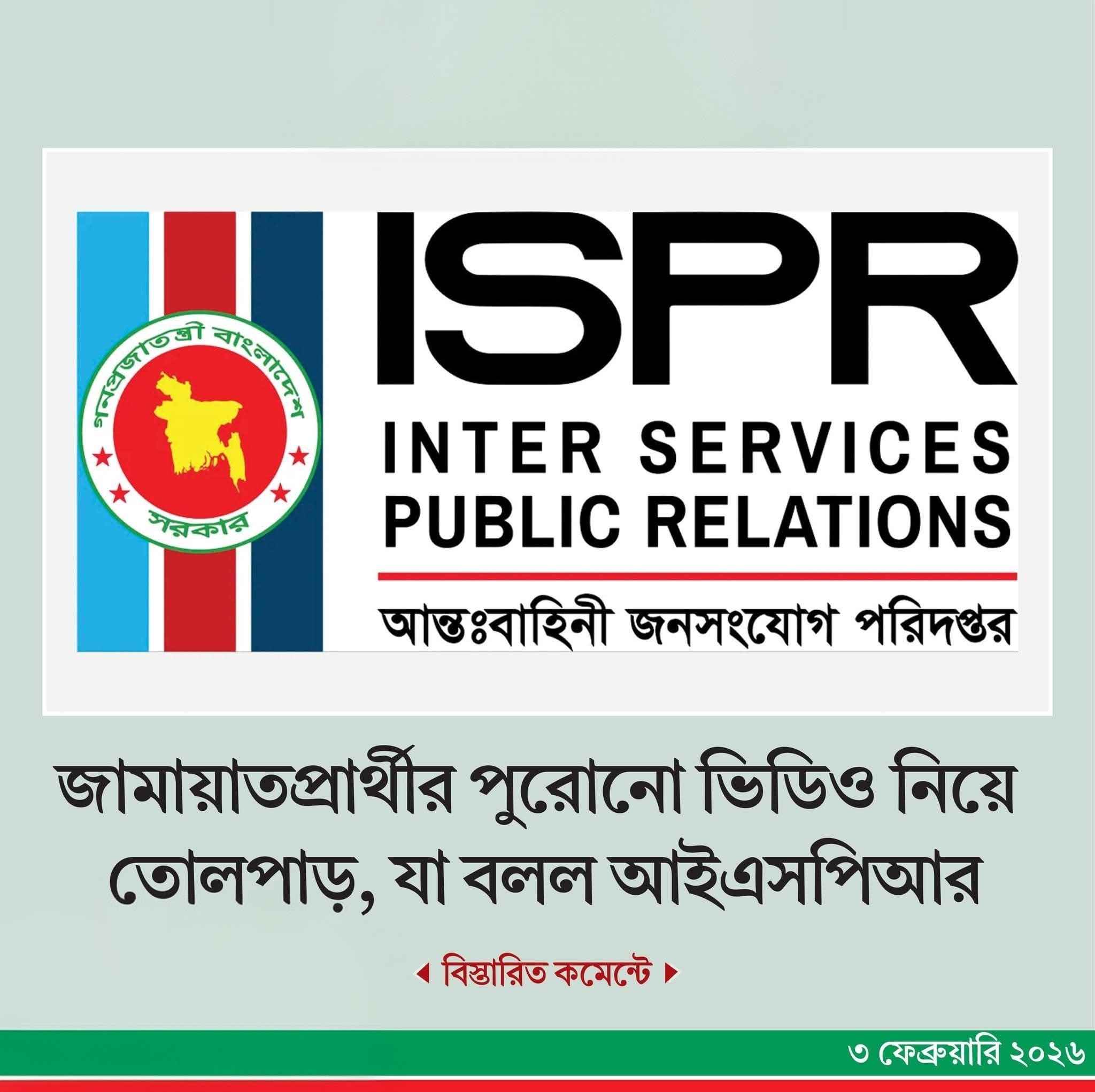 নিজস্ব প্রতিবেদক।। ঢাকা–১৭ আসনে জামায়াতে ইসলামীর প্রার্থী ডা. এস এম খালিদুজ্জামানকে কেন্দ্র করে ক্যান্টনমেন্ট এলাকায় এক মাস আগে ঘটে যাওয়া ‘অনাকাঙ্ক্ষিত ভিডিও’র বিষয়টি আগেই মীমাংসিত হয়েছিল বলে জানিয়েছে আন্তঃবাহিনী জনসংযোগ পরিদপ্তর (আইএসপিআর)। পুরোনো এই ভিডিও মঙ্গলবার আবার সামাজিক যোগাযোগমাধ্যমে ছড়িয়ে পড়লে নতুন করে আলোচনা শুরু হয়।