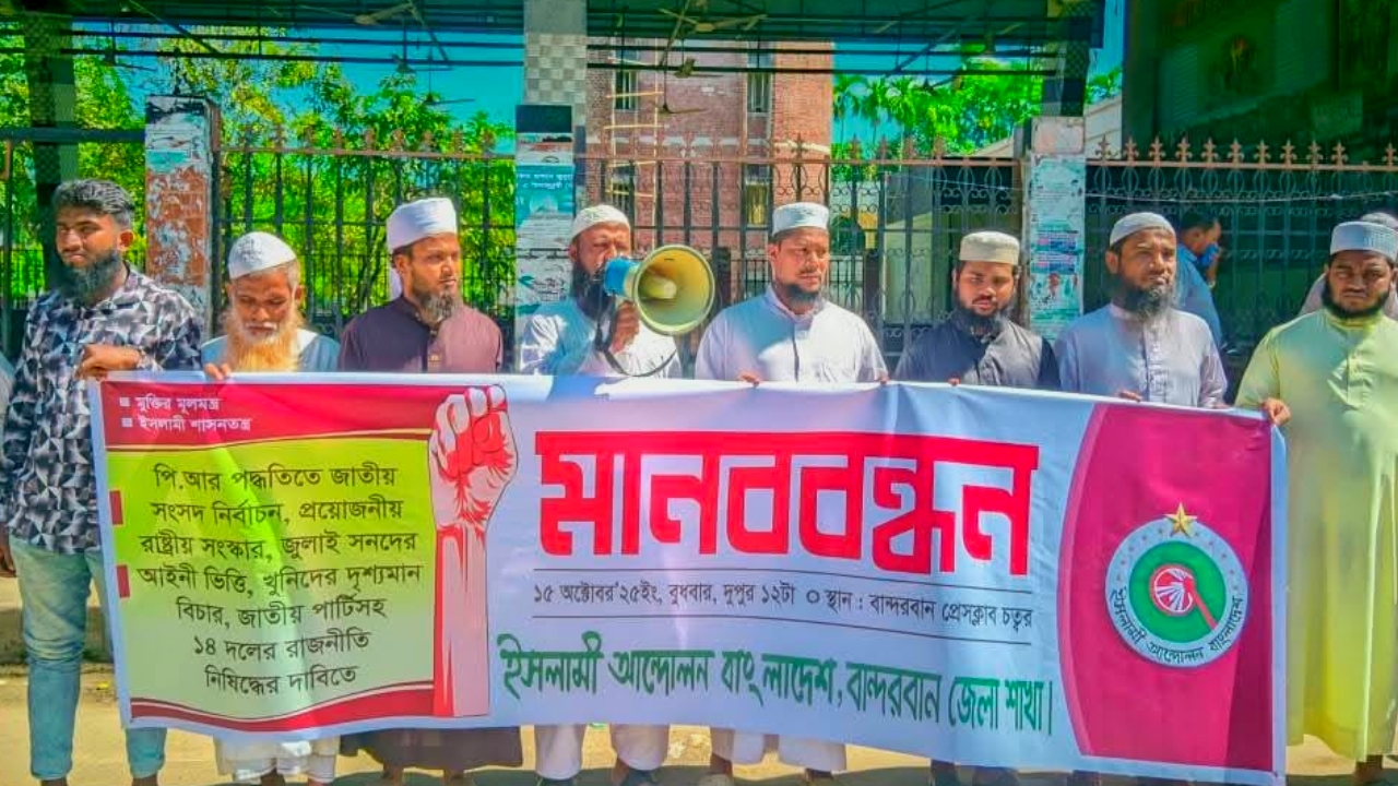 পিআর (প্রোপোরশনাল রিপ্রেজেন্টেশন) পদ্ধতি চালু ও ৫ দফা দাবি বাস্তবায়নের দাবিতে ইসলামী আন্দোলন বাংলাদেশ বান্দরবান জেলা শাখার উদ্যোগে মানববন্ধন কর্মসূচি অনুষ্ঠিত হয়েছে। বুধবার (১৫ অক্টোবর) সকাল ১০টায় বান্দরবান প্রেসক্লাবের সামনে এ মানববন্ধন অনুষ্ঠিত হয়। এটি যুগপৎ আন্দোলনের তৃতীয় ধাপের কর্মসূচির অংশ হিসেবে পালিত হয়।
