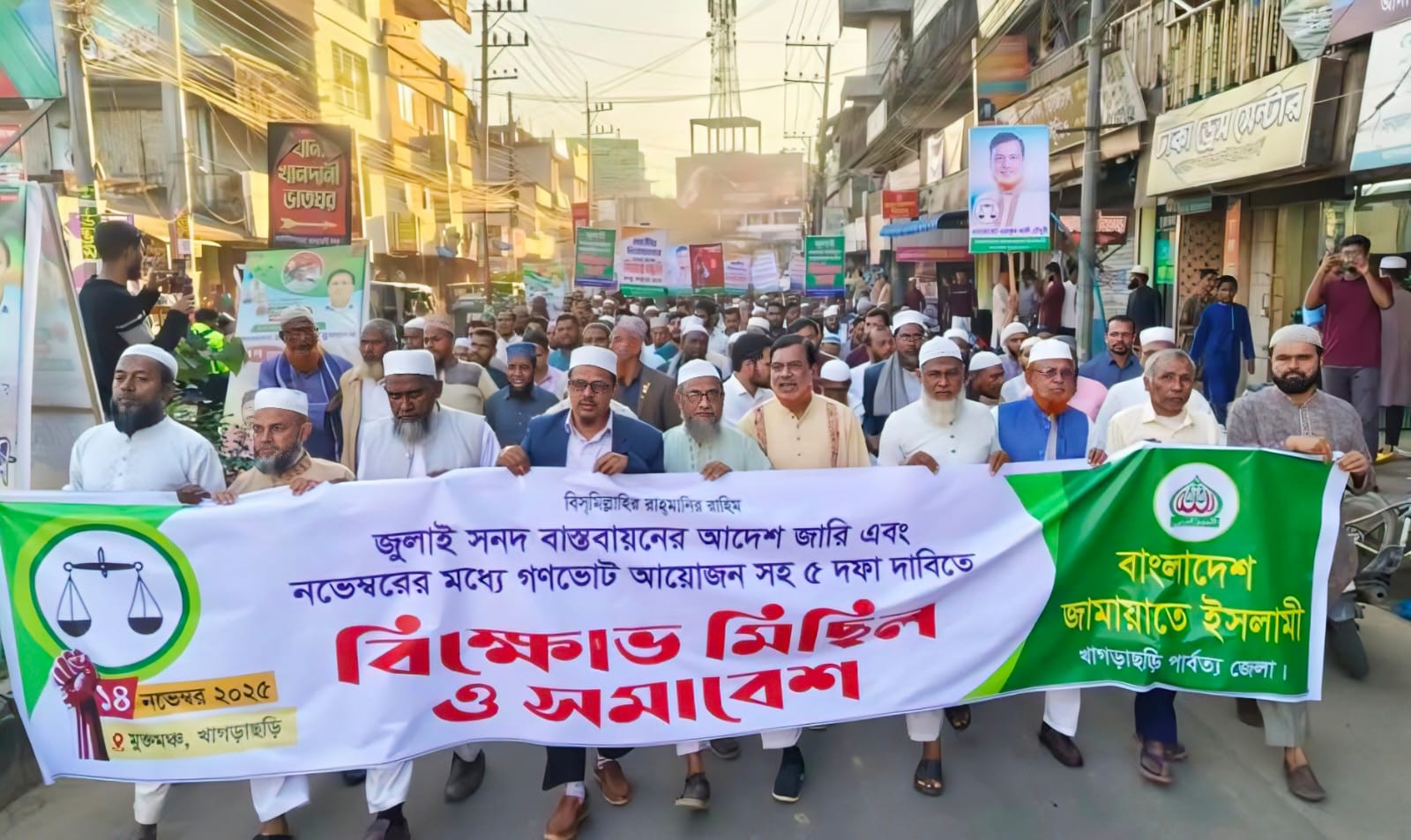 জুলাই সনদ বাস্তবায়নের আদেশ জারি ও নভেম্বরের মধ্যে গণভোট আয়োজনসহ ৫ দফা দাবিতে খাগড়াছড়িতে বিক্ষোভ মিছিল ও সমাবেশ করেছে বাংলাদেশ জামায়াতে ইসলামীর খাগড়াছড়ি জেলা শাখা। শুক্রবার (১৪ নভেম্বর) বিকেলে মুক্তমঞ্চ থেকে শুরু হওয়া মিছিলটি শহরের বিভিন্ন সড়ক প্রদক্ষিণ শেষে একই স্থানে সমাবেশে মিলিত হয়।