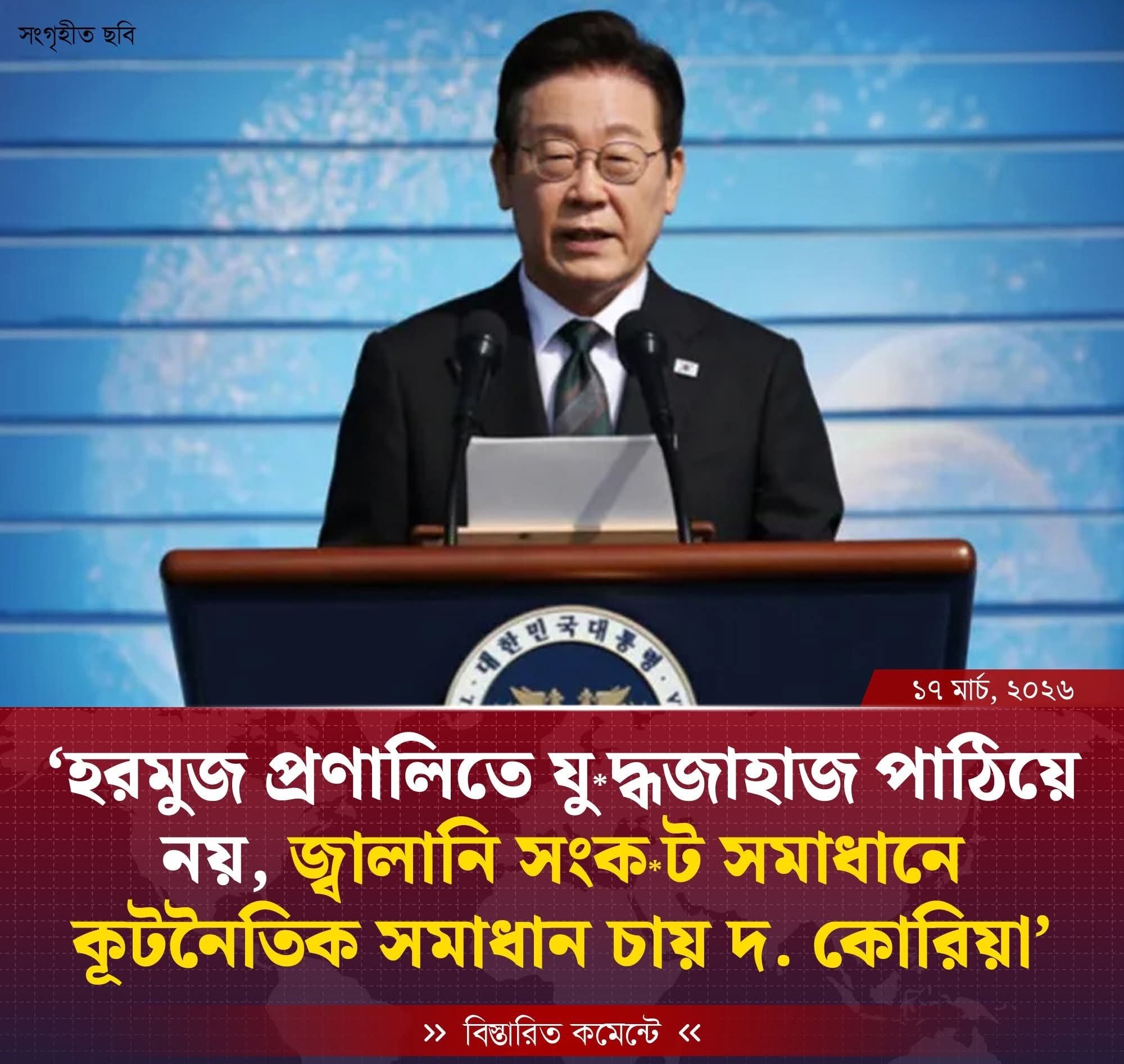 আন্তর্জাতিক ডেস্ক।। দক্ষিণ কোরিয়া হরমুজ প্রণালি সংকটের কূটনৈতিক সমাধান চায় বলে জানিয়েছেন দেশটির প্রেসিডেন্ট লি জেই ময়াং। তিনি বলেন, মধ্যপ্রাচ্যের সংকট দীর্ঘস্থায়ী হলে বৈশ্বিক জ্বালানি খাতে সবচেয়ে খারাপ পরিস্থিতির জন্যও প্রস্তুত থাকতে হবে।