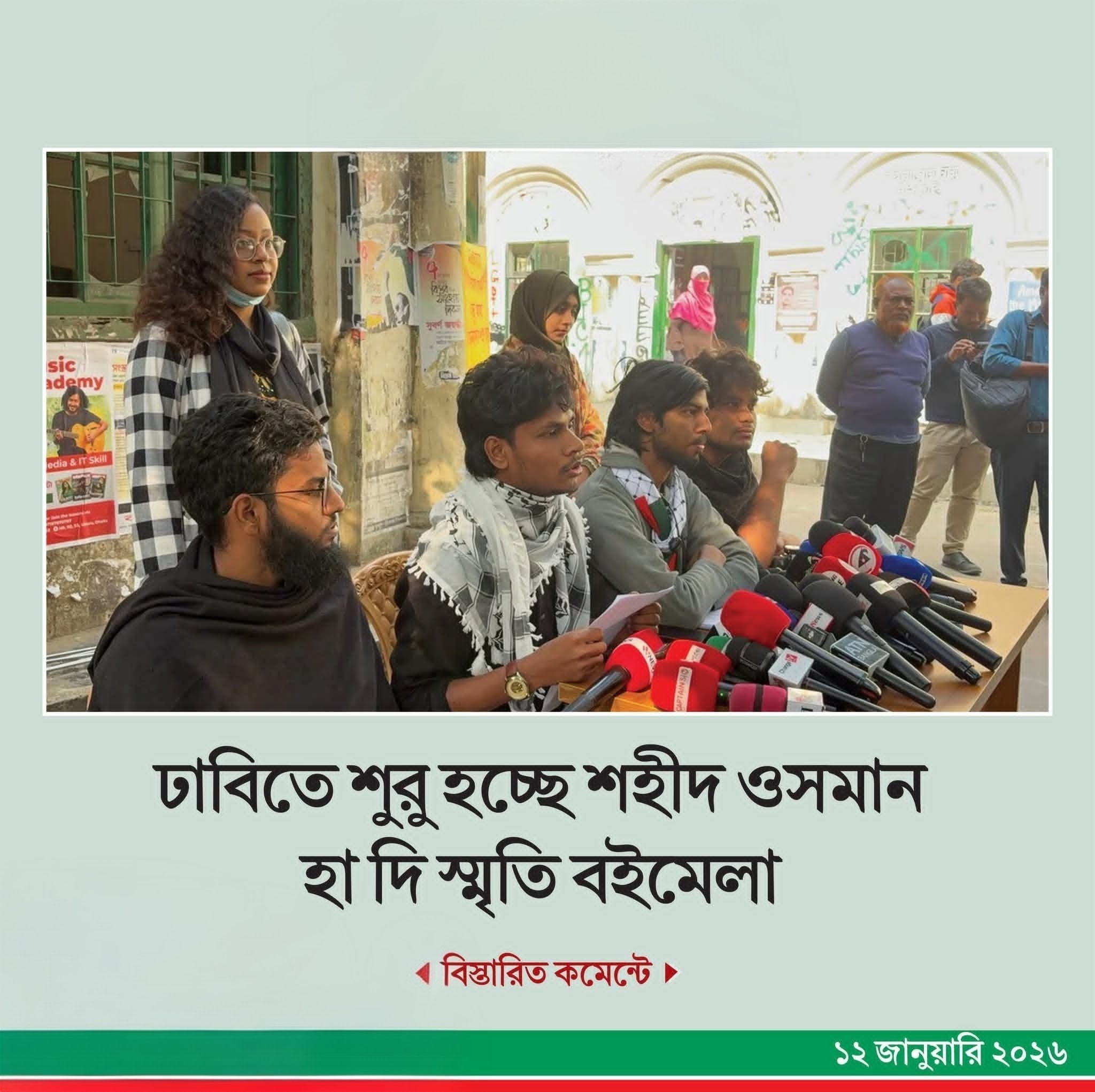 ঢাবি সংবাদদাতা।। ঢাকা বিশ্ববিদ্যালয় কেন্দ্রীয় ছাত্র সংসদ (ডাকসু) ও বাংলাদেশ তরুণ কলাম লেখক ফোরাম, ঢাকা বিশ্ববিদ্যালয় শাখার যৌথ উদ্যোগে আয়োজিত হচ্ছে শহীদ ওসমান হাদি স্মৃতি বইমেলা-২০২৬। আগামী ১৮ থেকে ২২ জানুয়ারি পর্যন্ত পাঁচ দিনব্যাপী এই বইমেলা অনুষ্ঠিত হবে ঢাকা বিশ্ববিদ্যালয়ের টিএসসি পায়রা চত্বরে। প্রতিদিন সকাল ৯টা থেকে রাত ৯টা পর্যন্ত বইমেলা সর্বসাধারণের জন্য উন্মুক্ত থাকবে।