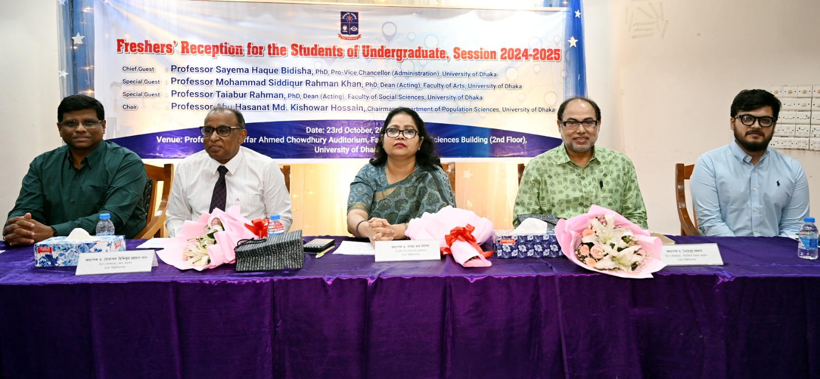 ঢাকা বিশ্ববিদ্যালয়ের উপাচার্যের রুটিন দায়িত্বে নিয়োজিত প্রো-ভাইস চ্যান্সেলর (প্রশাসন) অধ্যাপক ড. সায়মা হক বিদিশা অনুষ্ঠানে প্রধান অতিথি হিসেবে উপস্থিত ছিলেন।