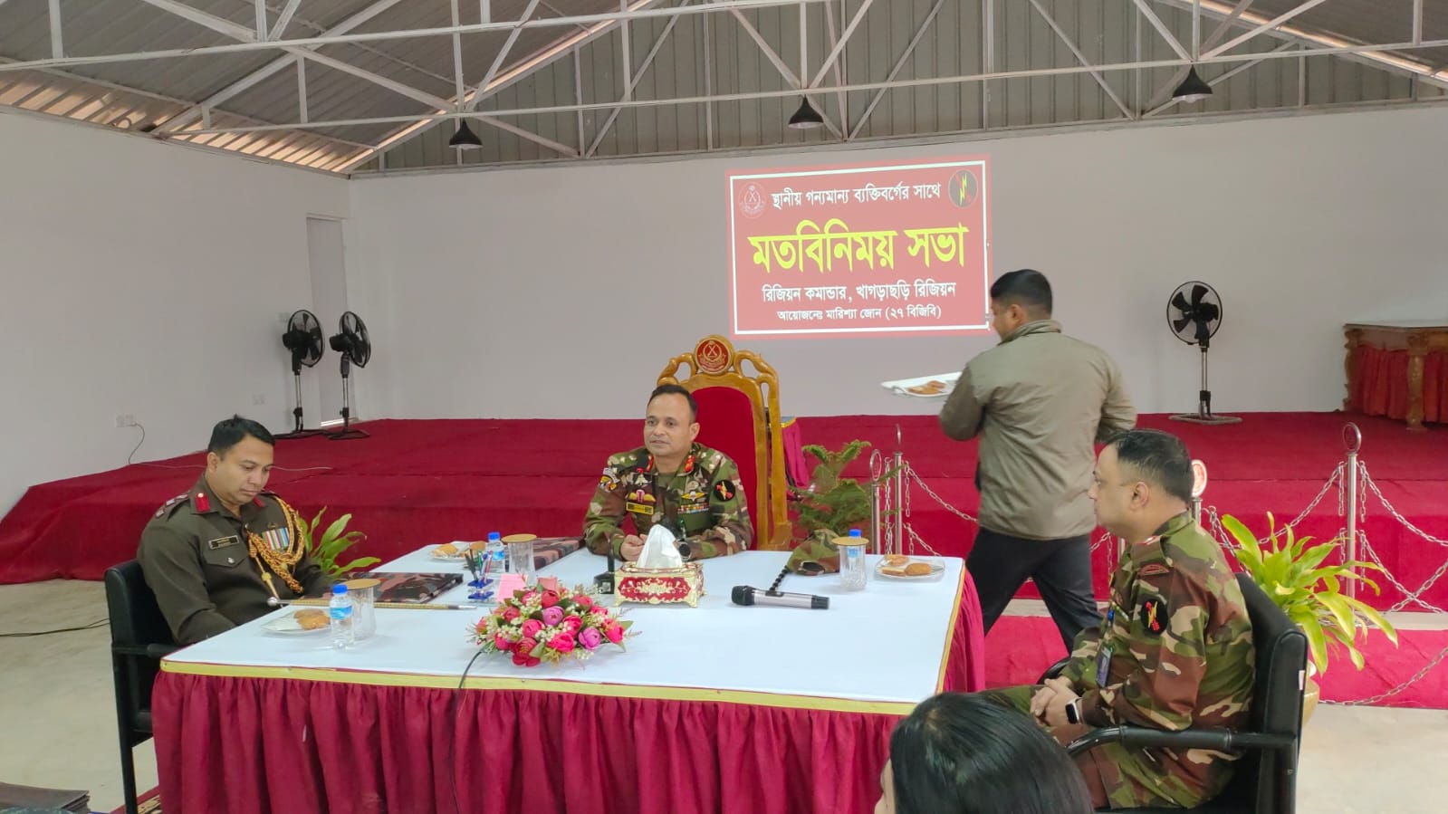 আজ সোমবার, ২৯ ডিসেম্বর সকাল ৯ ঘটিকায় মারিশ্যা জোন (২৭ বিজিবি)-এর আয়োজনে মারিশ্যা জোন সদরে খাগড়াছড়ি সেনা রিজিয়ন কর্তৃক বেসামরিক প্রশাসন, স্থানীয় জনপ্রতিনিধি, স্কুল-কলেজের শিক্ষক, গণমাধ্যমকর্মী ও স্থানীয় গণ্যমান্য ব্যক্তিবর্গের সঙ্গে মতবিনিময় সভা অনুষ্ঠিত হয়।