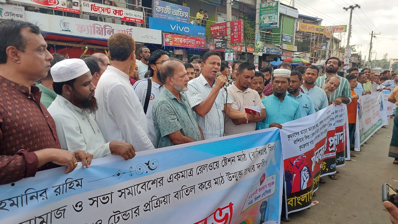 দোহাজারী রেলওয়ে স্টেশন মাঠ টেন্ডার প্রক্রিয়া বাতিলের দাবিতে মানববন্ধন ও বিক্ষোভ সমাবেশ