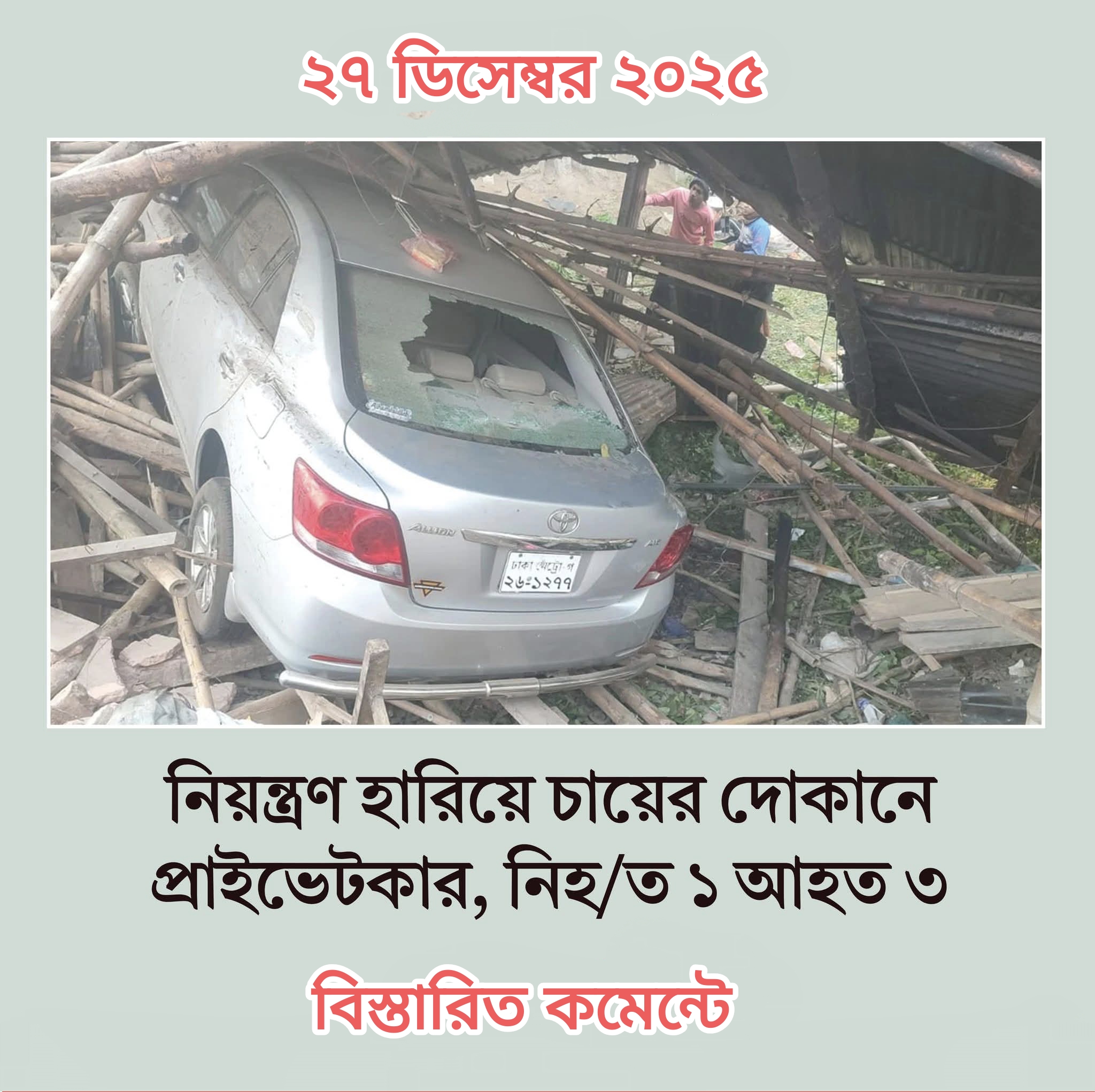 নিয়ন্ত্রণ হারিয়ে চায়ের দোকানে প্রাইভেটকার ঢুকে একজন নিহত, তিনজন আহত