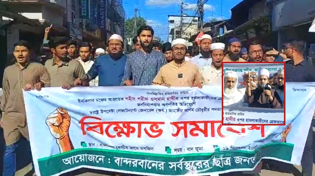 ইনকিলাব মঞ্চের আহ্বায়ক শহীদ শরীফ ওসমান হাদীর ওপর হামলার ঘটনায় জড়িত হালারীদের গ্রেফতারে ব্যর্থতা এবং সার্বিক জননিরাপত্তার অবনতির অভিযোগে বান্দরবানে সাধারণ ছাত্রজনতার উদ্যোগে বিক্ষোভ মিছিল অনুষ্ঠিত হয়েছে।