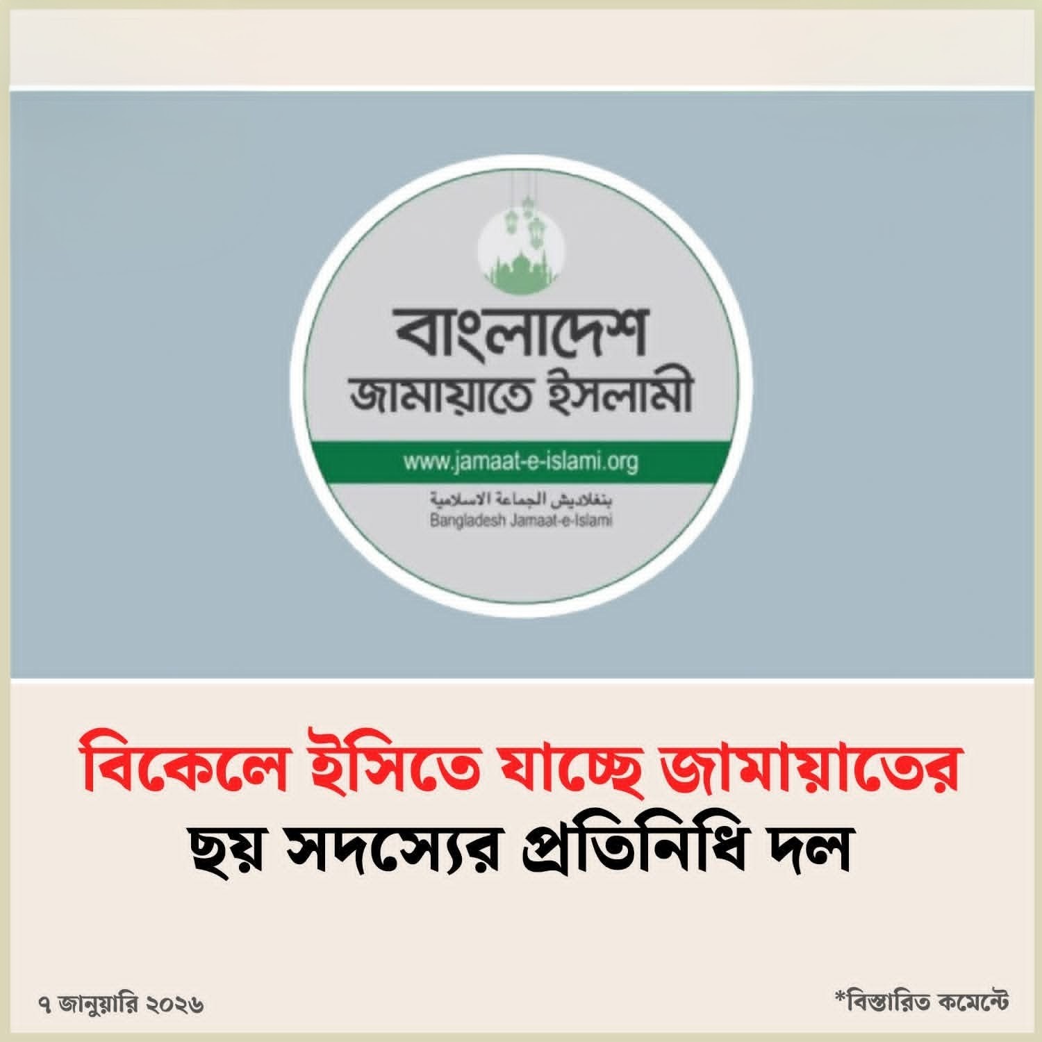 নিজস্ব প্রতিবেদক।। নির্বাচন কমিশনের সঙ্গে সাক্ষাৎ করতে আজ বুধবার (৭ জানুয়ারি) রাজধানীর আগারগাঁওস্থ নির্বাচন কমিশন ভবনে যাবে বাংলাদেশ জামায়াতে ইসলামীর ছয় সদস্যের একটি প্রতিনিধি দল।