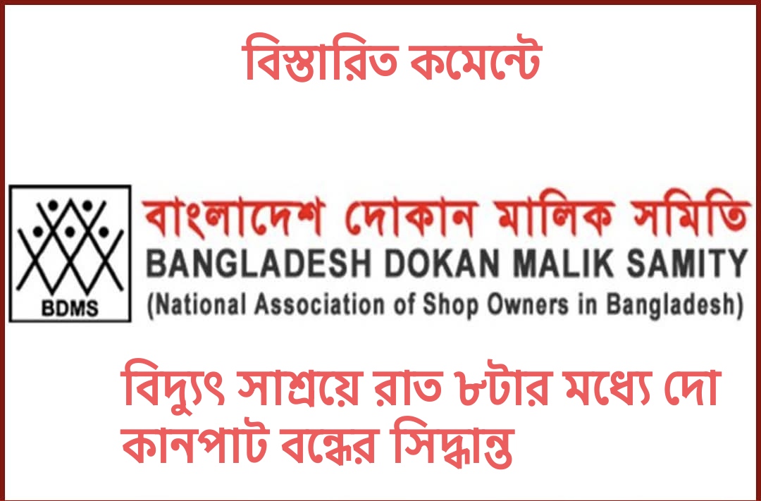 সংগঠনের বিজ্ঞপ্তিতে বলা হয়, “আন্তর্জাতিক জ্বালানি সংকটের কারণে বিদ্যুৎ ও জ্বালানি সাশ্রয় এ সরকারকে সহযোগিতার লক্ষে ঢাকা সহ বাংলাদেশের সকল দোকান, বাণিজ্য বিতান এবং শপিংমল সন্ধ্যা ৮ ঘটিকার মধ্যে বন্ধ রাখার সিদ্ধান্ত গৃহীত হয়।”