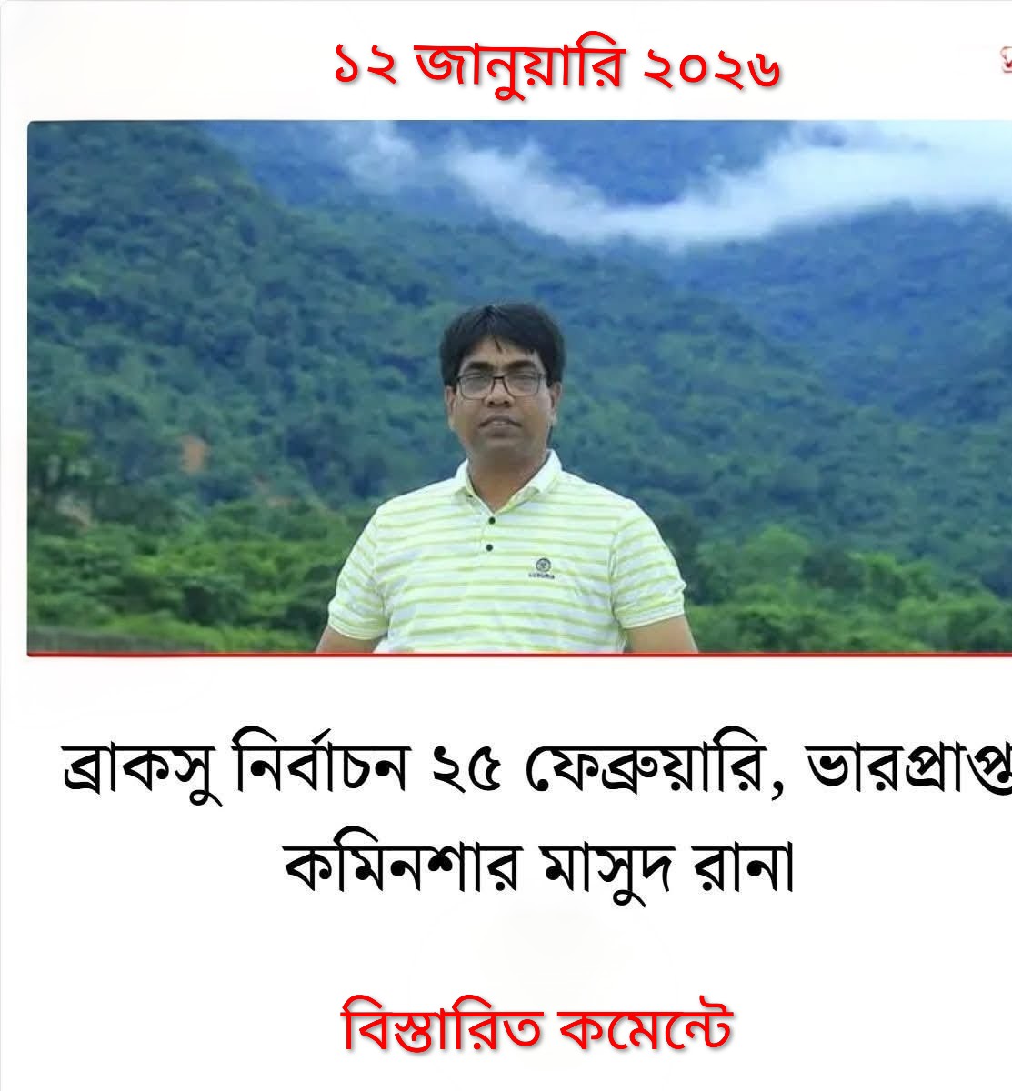 ভারপ্রাপ্ত প্রধান নির্বাচন কমিশনার সহযোগী অধ্যাপক মাসুদ রানা বলেন, আমরা আগামী কাল নির্বাচন কমিশনাররা বসে আমরা ভোটার তালিকার আপত্তি সমূহ নিষ্পত্তি করে চূড়ান্ত ভোটার তালিকা প্রকাশ করব। এছাড়াও নির্বাচন ২৫ ফেব্রুয়ারি করার জন্য সেই অনুযায়ী তফশিল পুর্নগঠন করব।