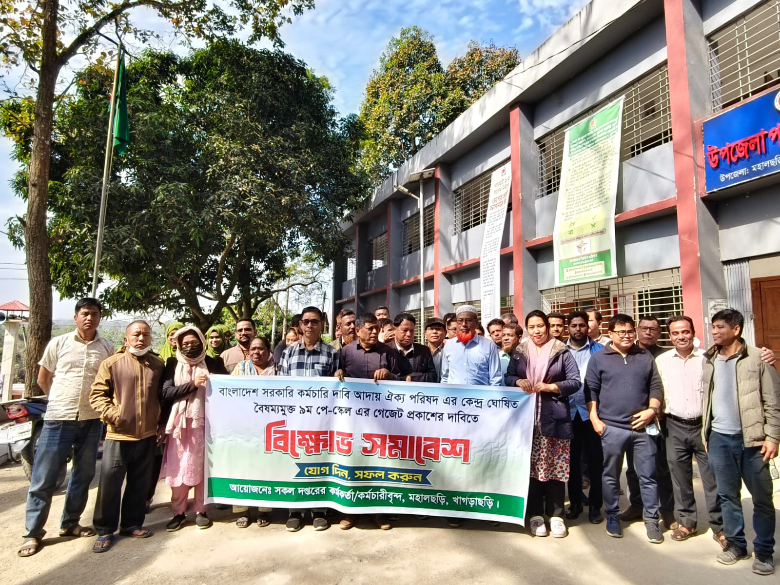 মহালছড়িতে নবম পে-স্কেল প্রজ্ঞাপন জারির দাবিতে সরকারি কর্মকর্তা ও কর্মচারীদের বিক্ষোভ
