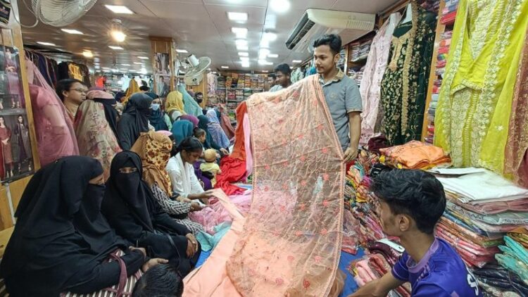 দেশীয় জামদানি, টাঙ্গাইল ও তাঁতের নতুন ডিজাইনের শাড়িসহ নারীদের বিভিন্ন পোশাক বিক্রি হচ্ছে ধুমধারাক্কা। ফ্যাশনের পাশাপাশি ঐতিহ্যতেও গুরুত্ব দিচ্ছেন নারীরা। আর প্রচুর কালেকশনের পাশাপাশি দাম স্বাভাবিক থাকায় খুশি তারা।