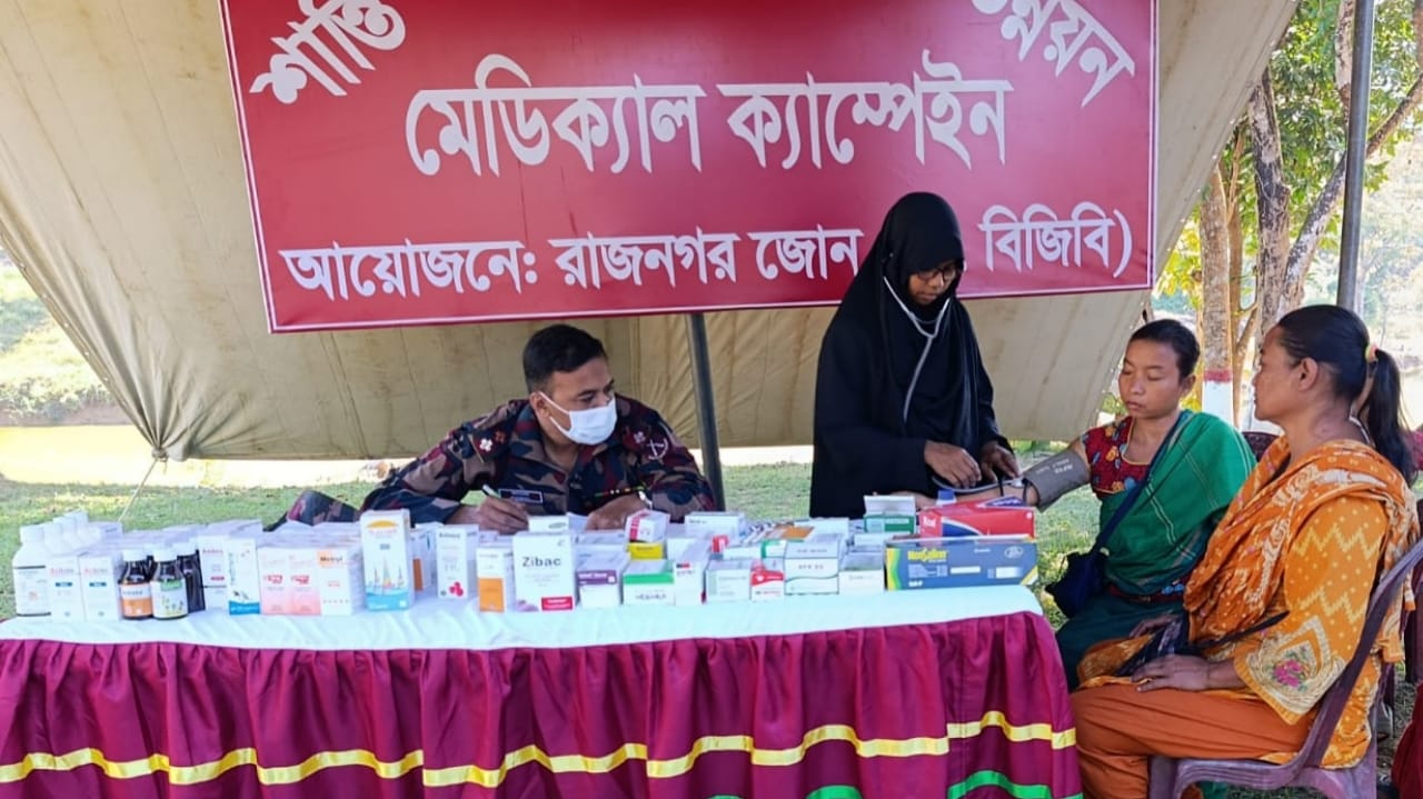 পার্বত্য এলাকার সাধারণ মানুষের স্বাস্থ্যসেবা নিশ্চিত করার লক্ষ্যে বর্ডার গার্ড বাংলাদেশ (বিজিবি) এর রাজনগর ব্যাটালিয়ন (৩৭ বিজিবি) এর ব্যবস্থাপনায় বৃহস্পতিবার (১৮ ডিসেম্বর) রাজনগর এলাকায় একটি ফ্রি মেডিক্যাল ক্যাম্পেইন অনুষ্ঠিত হয়।