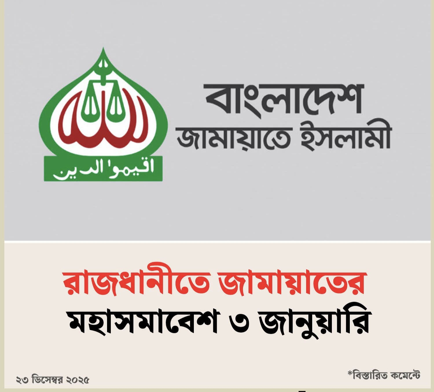 রাজধানীতে জামায়াতের মহাসমাবেশ ৩ জানুয়ারি