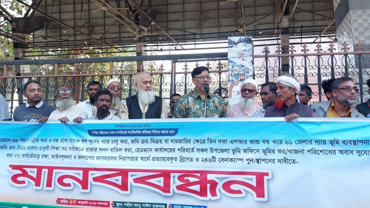 মঙ্গলবার (২০ জানুয়ারি) বান্দরবান জেলা শহরে পার্বত্য চট্টগ্রাম নাগরিক পরিষদ ও সর্বস্তরের জনগণের ব্যানারে এ মানববন্ধন অনুষ্ঠিত হয়। মানববন্ধনে জমি ক্রয়-বিক্রয় বা নামজারির ক্ষেত্রে তিন দফা এলআর ফান্ড বন্ধ করে দেশের ৬১ জেলার ন্যায় ভূমি ব্যবস্থাপনা ও রেজিস্ট্রেশন ব্যবস্থা চালুর দাবি জানানো হয়। পাশাপাশি জমি ক্রয়-বিক্রয়, ব্যবসা, চাকরি ও শিক্ষাসহ সর্বক্ষেত্রে রাজার সনদ বাতিল, হেডম্যান কার্যালয়ের পরিবর্তে সকল উপজেলা ভূমি অফিসে ভূমির কর ও খাজনা পরিশোধের অবাধ সুযোগ সৃষ্টি এবং সার্বভৌমত্ব রক্ষা, আইনশৃঙ্খলা ও জানমালের নিরাপত্তার স্বার্থে প্রত্যাহারকৃত ব্রিগেড ও ২৪৬টি সেনাক্যাম্প পুনঃস্থাপনের দাবি উত্থাপন করা হয়।