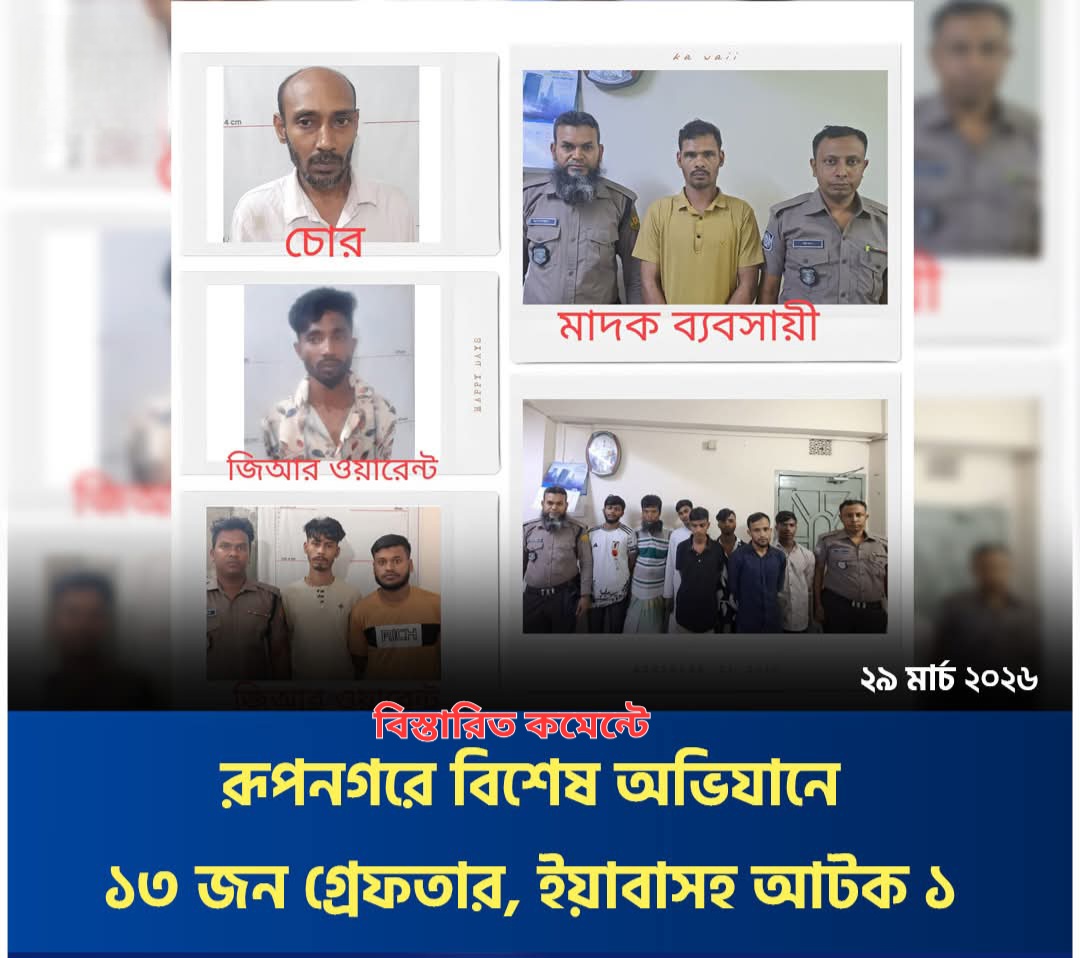 রুপনগর থানার বিশেষ অভিযানে মাদক অপহরণ চুরি পরোয়ানা-এজাহারভুক্ত আসামিসহ ১৩জন গ্রেফতার
