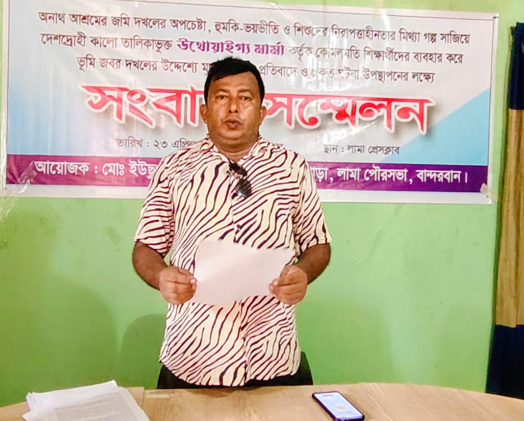 লামা উপজেলায় জমি দখলের অপচেষ্টা, হুমকি-ভয়ভীতি প্রদর্শন ও শিশুদের নিরাপত্তাহীনতার প্রতিবাদ জানিয়ে মানববন্ধন করেছেন অনাথ আশ্রমের পরিচালক উথোয়াইগ্য মার্মা নামের এক বাসিন্দা। পাল্টা অভিযোগ এনে অনাথ আশ্রমের পরিচালক উথোয়াইগ্য মার্মাকে ‘দেশদ্রোহী ও পুলিশের কালো তালিকাভুক্ত’ দাবি তুলে সংবাদ সম্মেলন করে প্রতিবাদ জানিয়ে ঘটনার বিবরণ উপস্থাপন করেন মোঃ ইউছুপ নামের এক সংবাদকর্মী।