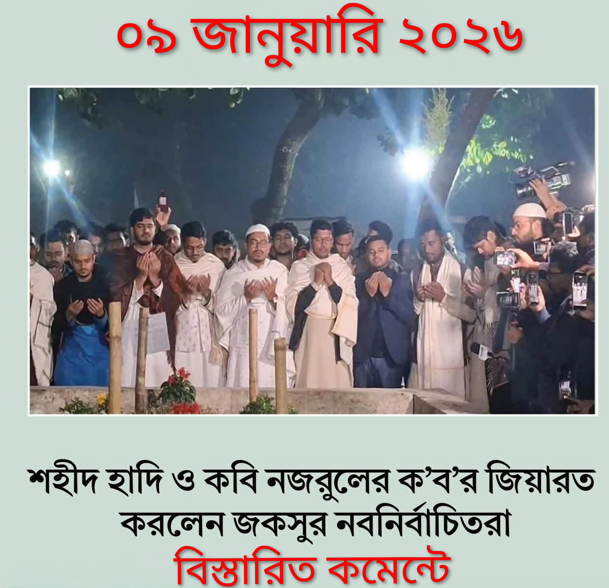 - ঢাবি সংবাদদাতা।। জগন্নাথ বিশ্ববিদ্যালয় কেন্দ্রীয় শিক্ষার্থী সংসদ (জকসু) নির্বাচনে সদ্য নির্বাচিত প্রতিনিধিরা আধিপত্যবাদবিরোধী আন্দোলনে শহীদ শরীফ ওসমান হাদী এবং জাতীয় কবি কাজী নজরুল ইসলামের প্রতি শ্রদ্ধা জানাতে তাঁদের কবর জিয়ারত করেছেন।