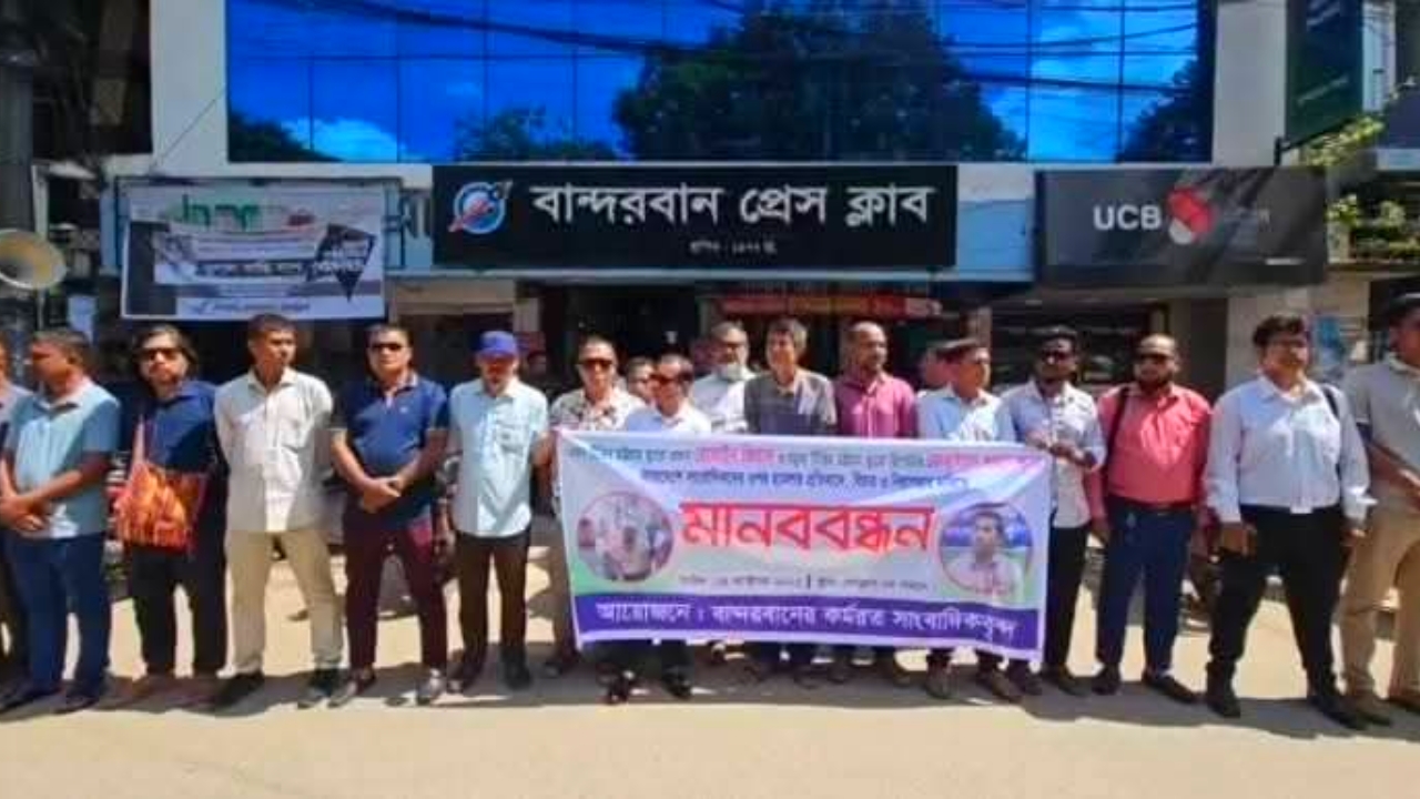 মঙ্গলবার (১৪ অক্টোবর) দুপুরে বান্দরবান প্রেসক্লাবের সামনে এই মানববন্ধন অনুষ্ঠিত হয়। এতে জেলার বিভিন্ন উপজেলা থেকে আগত প্রিন্ট ও ইলেকট্রনিক মিডিয়ার সাংবাদিকরা অংশ নেন।