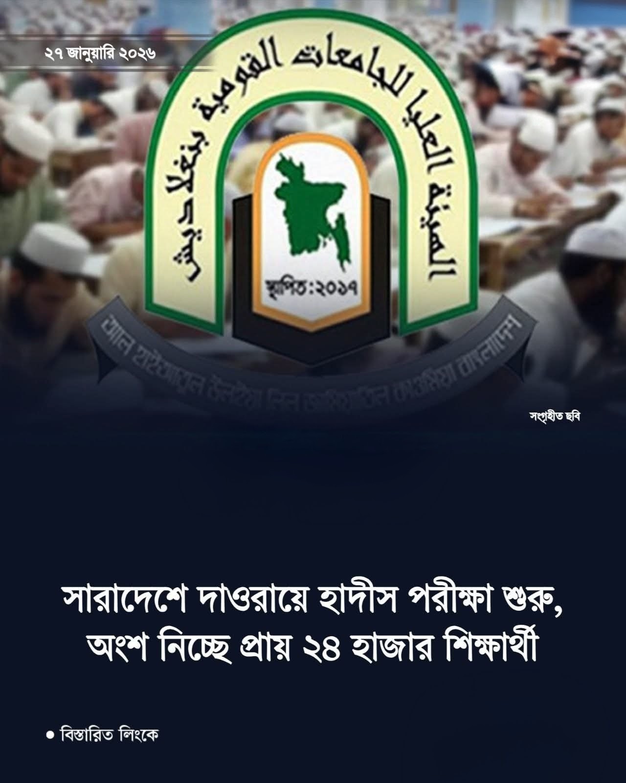অনলাইন ডেস্ক।। কওমি মাদরাসা শিক্ষাব্যবস্থার সর্বোচ্চ স্তর দাওরায়ে হাদীস পরীক্ষার আনুষ্ঠানিক কার্যক্রম সারাদেশে আজ মঙ্গলবার শুরু হয়েছে। ৭ শা‘বান ১৪৪৭ হিজরি, ২৭ জানুয়ারি ২০২৬ ঈসাব্দ থেকে অভিন্ন প্রশ্নপত্রে সারা দেশে এই গুরুত্বপূর্ণ পরীক্ষা অনুষ্ঠিত হচ্ছে।