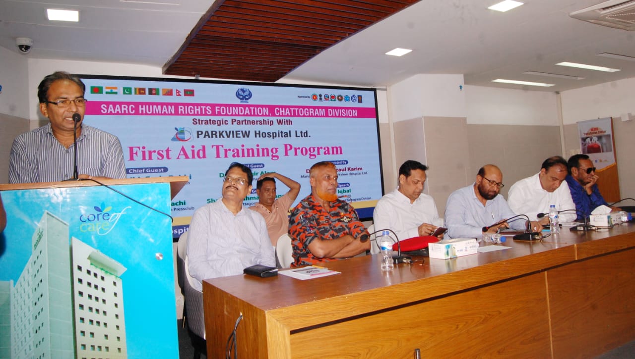 সার্ক মানবাধিকার ফাউন্ডেশন চট্টগ্রাম বিভাগের আয়োজনে প্রাথমিক চিকিৎসা প্রশিক্ষণ কর্মশালা ২৫ অক্টোবর শনিবার সকাল ১১টায় পার্ক ভিউ হাসপাতালের কনফারেন্স হল রুমে অনুষ্ঠিত হয়। এতে অতিথি হিসেবে উপস্থিত ছিলেন ফায়ার সার্ভিস ও সিভিল ডিফেন্স চট্টগ্রামের সহকারী পরিচালক মো. আনোয়ার হোসেন, পুলিশ ব্যুরো অব ইনভেস্টিগেশন (পিবিআই)-এর এএসপি আবু জাফর মো. ওমর ফারুক, চট্টগ্রাম মহানগর বিএনপির যুগ্ম আহ্বায়ক শফিকুল রহমান স্বপন, ডা. মো. সালাউদ্দিন এম.এ.ইউ.এইচ. চৌধুরী, ব্যারিস্টার সওগাতুল আনোয়ার খান এবং মানবাধিকার সংগঠক ও রাজনীতিবিদ আনিসুল ইসলাম চৌধুরী।