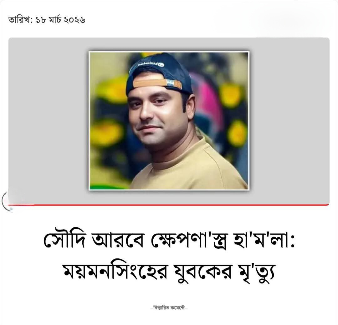 সৌদি আরবে ক্ষেপণাস্ত্র হামলায় আহত বাংলাদেশি প্রবাসীর যুবকের মৃত্যু