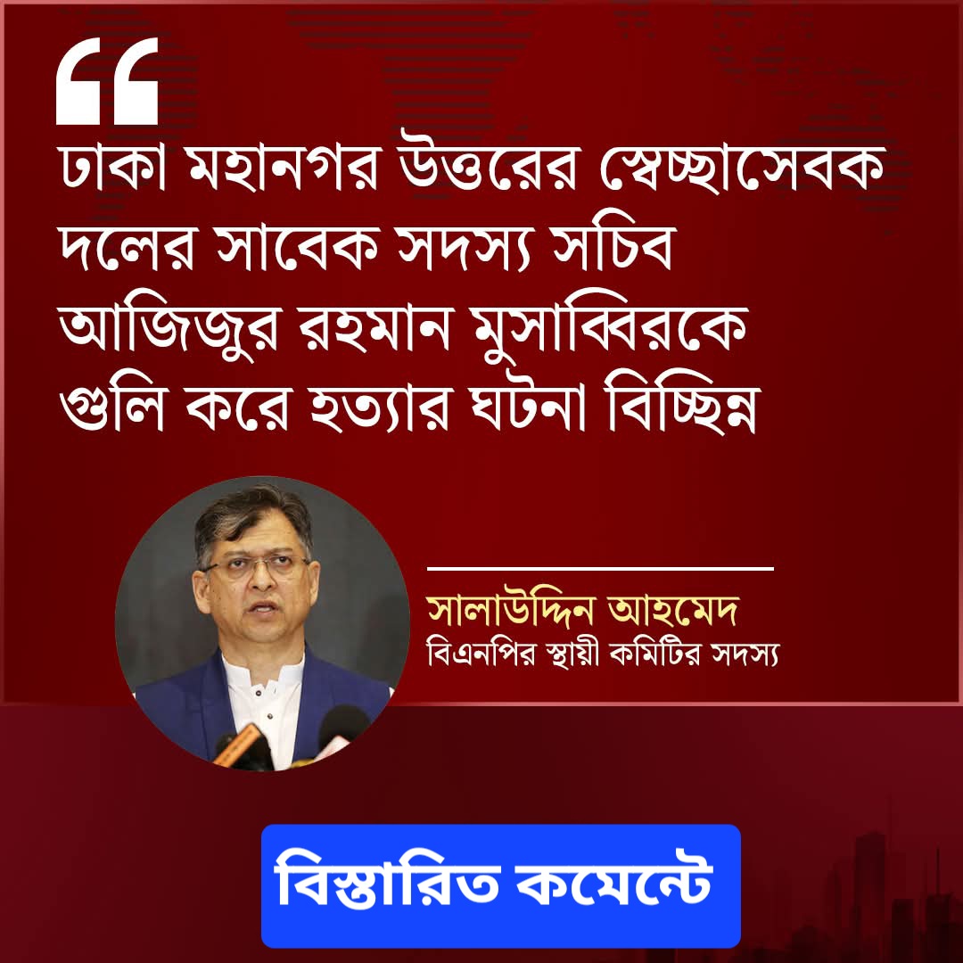 নিজস্ব প্রতিবেদক।। বিএনপির স্থায়ী কমিটির সদস্য সালাউদ্দিন আহমদ বলেছেন, রাজধানীতে ঢাকা মহানগর উত্তরের স্বেচ্ছাসেবক দলের সাবেক সদস্য সচিব আজিজুর রহমান মুসাব্বিরকে গুলি করে হত্যার ঘটনা বিচ্ছিন্ন। পতিত ফ্যাসিবাদী শক্তি দেশের গণতান্ত্রিক যাত্রাকে ব্যাহত করতে আইনশৃঙ্খলা পরিস্থিতির অবনতি ঘটাচ্ছে।