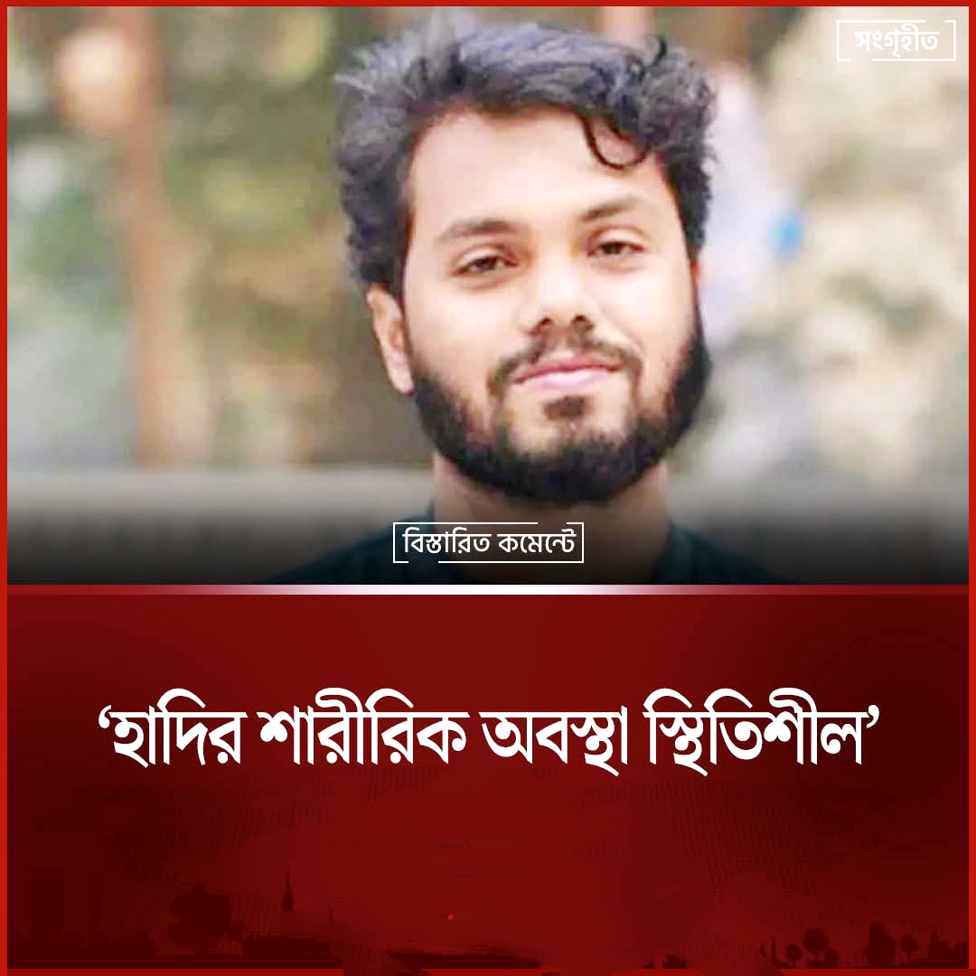 তিনি আরও জানান, ওসমান হাদির স্বাস্থ্যের অবস্থা স্থিতিশীল হলে তার জন‍্য অতি প্রয়োজনীয় সব স্বাস্থ্যগত পরীক্ষা সোমবার দিবাগত রাতেই (বাংলাদেশ সময় রাত ২টা পর্যন্ত) সম্পন্ন করা হয়। তাকে বিশেষায়িত আইসিইউতে রাখা হয়েছে। সোমবার রাত থেকে আজ মঙ্গলবার দুপুর পর্যন্ত চিকিৎসকরা তাকে নিবিড় পর্যবেক্ষণে রাখবেন।
