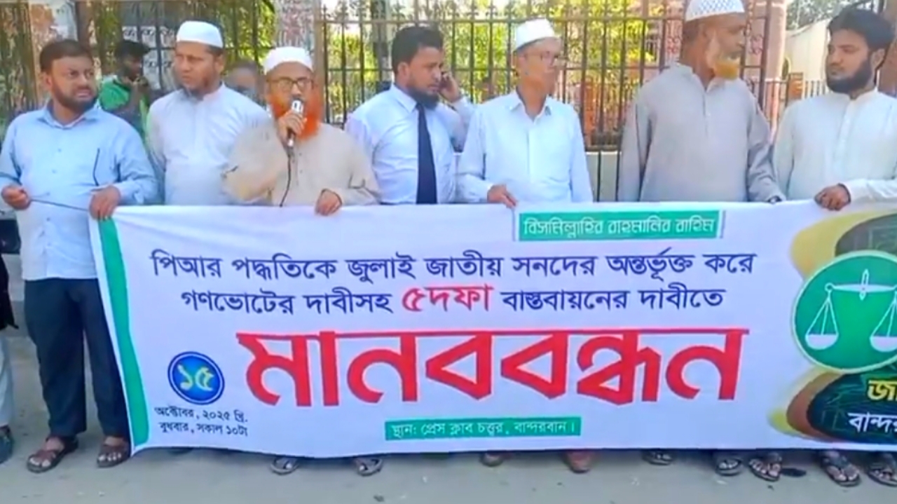 প্রোপোরশনাল রিপ্রেজেন্টেশন (পিআর) পদ্ধতিসহ পাঁচ দফা দাবিতে বান্দরবান জেলা জামায়াতে ইসলামীর উদ্যোগে মানববন্ধন কর্মসূচি অনুষ্ঠিত হয়েছে।