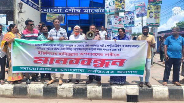 মোংলায় প্রকৌশলী হাবিবুল্লাকে অপসারণের দাবীতে মানববন্ধন