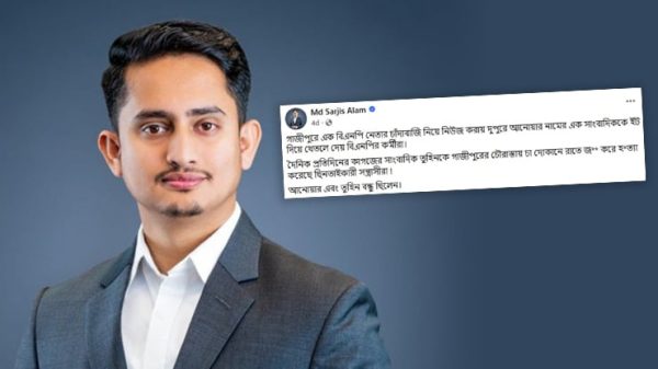জাগো জনতা অনলাইন।। সাংবাদিক তুহিন হত্যায় বিএনপিকে জড়িয়ে অপপ্রচারের অভিযোগে জাতীয় নাগরিক পার্টির (এনসিপি) উত্তরাঞ্চলীয় মুখ্য সংগঠক সারজিস আলমের বিরুদ্ধে গাজীপুর সিএমএম কোর্টে মামলা দায়ের…